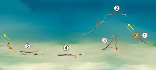 - Проводка ступенями. В этом случае груз сначала опускают на дно, затем начинают медленно подматывать катушку, что приподнимает груз над дном. Затем его опускают вновь, разматывая лесочную нить с помощью катушки. При такой игре не происходит лишних звуков, рыба не пугается лишний раз, а игра привлекает.