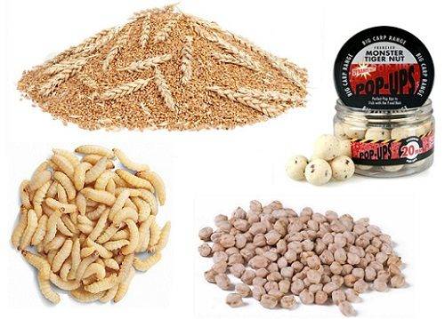 Растительные ингредиенты все знают. К ним относятся хлеб, кукуруза, творог, вареный картофель, перловка, пшено. К приманкам животного происхождения можно отнести опарыша, навозных червей, короедов, личинок стрекоз и ручейников, куколок. Все эти наживки показали себя с лучшей стороны при ловле карпа.