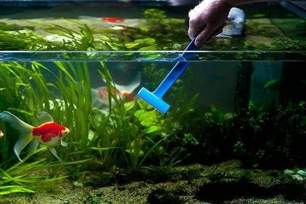 Вначале вам нужно почистить стенки аквариума, не сливая воды. Наденьте на руки перчатки, но только новые. Используйте для удаления налета на стекле скребок, а для особо сложных мест – нож. Губки с кухни использовать нельзя, на них могли остаться моющие средства.