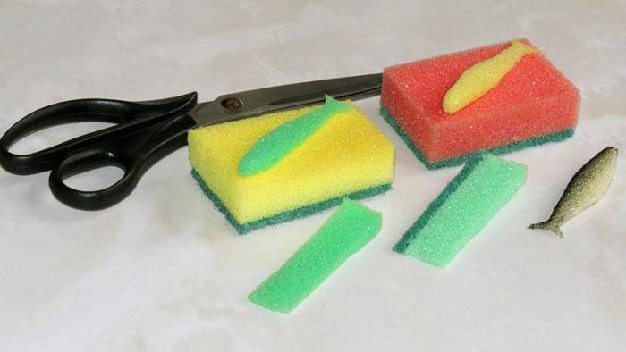 - из кусочка поролона острыми ножницами или канцелярским ножом вырезается тело приманки в виде рыбки или усеченного конуса;