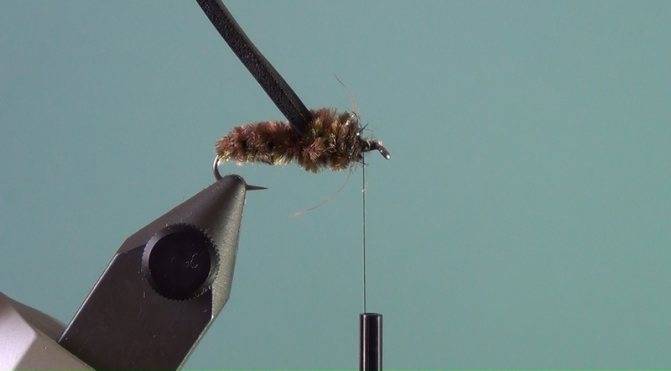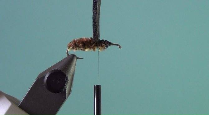 7. Выберем материал для грудки насекомого — это может быть даббинг темного цвета или, как в нашем случае, синель. В принципе мы мог ли бы не обрезать ту синель из которой мы делали тело овода.