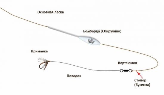 Обязательным элементом снасти являются два стопорных элемента на конце основной лески, определяющие границы хода по ней бомбарды. Нижний стопор, располагающийся в 3–5 см от конца лески, предохраняет вертлюжок от столкновения с бомбардой, а верхний, расположенный выше бомбарды, не даёт бомбарде слишком высоко скользить по основной леске.
