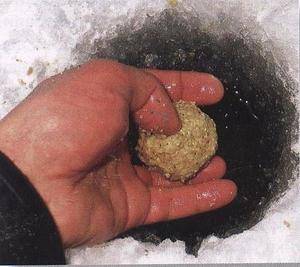 Еще одна особенность прикорма для зимней рыбалки связана с ее рассыпчатостью и незначительной клейкостью. В том случае, если прикорм имеет вид плотного шара, то при попадании в воду он должен рассыпаться и превратиться в мелкие частицы.
