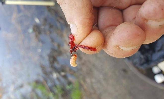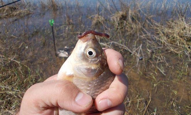 Земляные черви слишком крупные для карася. Их приходится делить на несколько частей, а это снижает время жизни насадки на крючке.