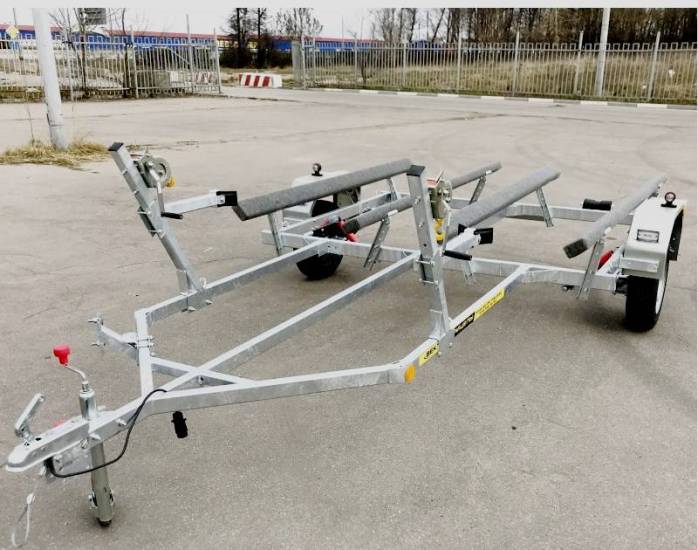 Это изделие предназначено для транспортировки ПВХ лодок весом до 300 кг. Максимальная протяженность – 3,8 м. Для изготовления дышла и рамы применяется высокопрочный стальной сплав. В качестве защитной прослойки используется цинковое напыление. Дышло оснащено замковым механизмом. Также в комплекте идет страховочный трос и специальный держатель для штекера. За повышенное удобство в использовании отвечают рессоры листового типа, жесткая подвеска и масляные амортизаторы. Оснащен двумя колесами на 13 дюймов. В основе лежит использование ложементов регулируемого типа. За точность фиксации отвечает адаптированный кронштейн. Масса изделия – 160 кг.