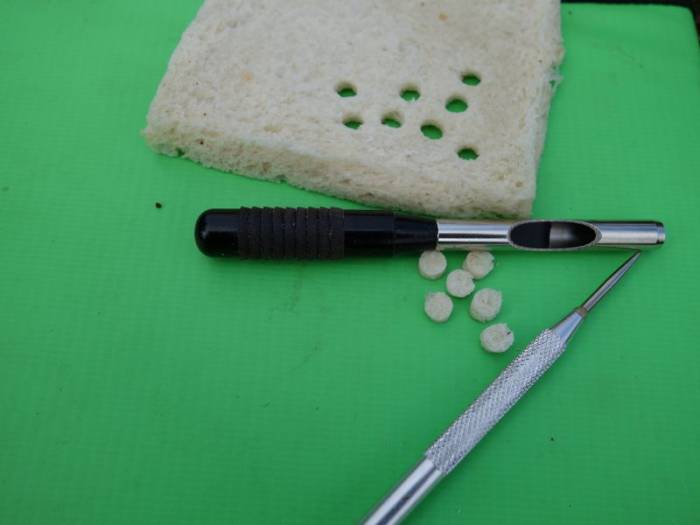 Итак, каким же образом работает этот инструмент? Берем ломтик хлеба, кладем на твердую ровную поверхность и втыкаем в него высечку. Получается, что углубление в ней заполняется хлебом, а за счет того, что толщина ломтя больше, чем глубина высечки, гранула получается спрессованной и, следовательно, потом она надежнее держится на крючке.