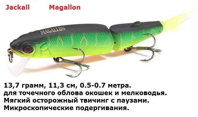 При длине 11.3 см весит 13.7 граммов, при этом заглубление – до 1 метра. Проводка – медленные и аккуратные подергивания с отдачей шнура, мягкие тычки, паузы до 8 секунд. Если все сделано правильно – магаллон на паузе заходит в сторону и заносит брюшко вверх. Это показывание брюшка как раз и действует магически на щуку. Воблер оснащен силиконовым хвостиком, который быстро откусывается щукой. Но это не проблема – без хвоста магалон ловит и играет точно также, это скорее элемент для красоты и маркетинга.