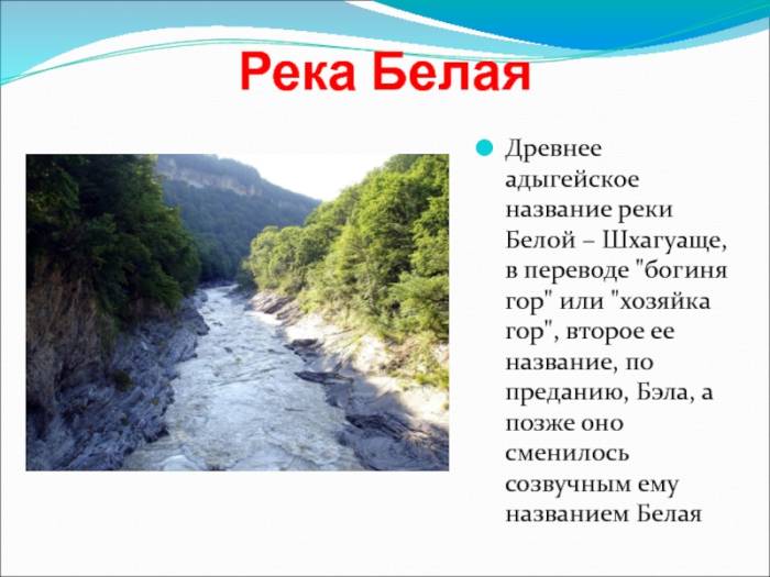 Слайд 6Река БелаяДревнее адыгейское название реки Белой – Шхагуаще, в