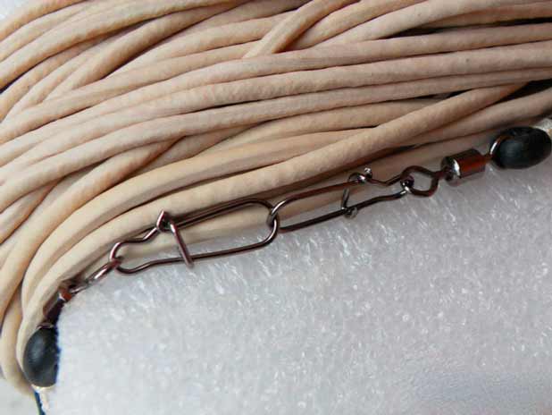 Для резинового амортизатора обычно используют прочную резину круглого сечения. Иногда ставят двойную резину, свитую из той же самой круглой резины. Это увеличивает прочность амортизатора. Длина резинового амортизатора обычно не превышает 10-12 метров. Этого хватает, чтобы завезти на лодке груз на 50-60 метров от берега. Обычно для подстраховки груз снабжают буйком, чтобы при обрыве резинки можно было поднять со дна груз и починить снасть. Также резинку снабжают страховочным шнуром, за который можно вытянуть груз. Но снасть при этом делается более громоздкой. Поэтому страховочный шнур чаще применяют при забросе резинки с берега рукой, то есть груз забрасывается, а не завозится на лодке. В этом случае нахождение крючков будет намного ближе к берегу. И такой способ заброса груза годится больше для малой реки и пруда. Резиновый амортизатор в этом случае укорачивается до 5 метров.