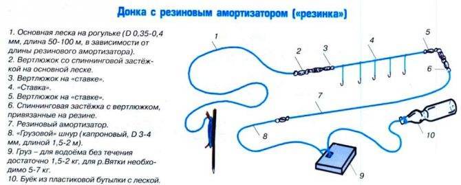 Внешне она схожа с обычной донной снастью. Отличие заключается в наличии резинового амортизатора, чаще всего из «венгерки», прикрепленного к грузилу. На леске крючки располагаются в ряд. После заброса на определенное расстояние рыбак может вытащить леску с крючками для снятия добычи или смены наживки. При этом снасть резинка забрасывается только один раз. Исключение – желание смены расположения.