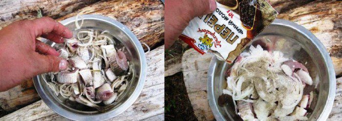 - Накройте миску пищевой плёнкой, или просто тарелкой, и погуляйте 20-30 минут. Да, некрупный хариус засаливается так быстро. За это время лук пустит сок, растворит соль, и хариус пропитается ароматом специй, но не утратит свой вкус.