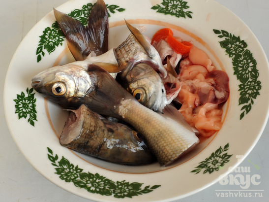 Берутся головы, хребет, плавники. Все заливается студёной водой так, чтобы она чуть-чуть прикрыла содержимое. Через 5 минут после закипания гуща удаляется. В бульон закладываются специально отобранные головы или порционные куски, доводится до кипения и варится на медленном огне около 5-8 минут (в зависимости от размера рыбы). Основное правило — не переваривать! Соль, перец – по вусу.