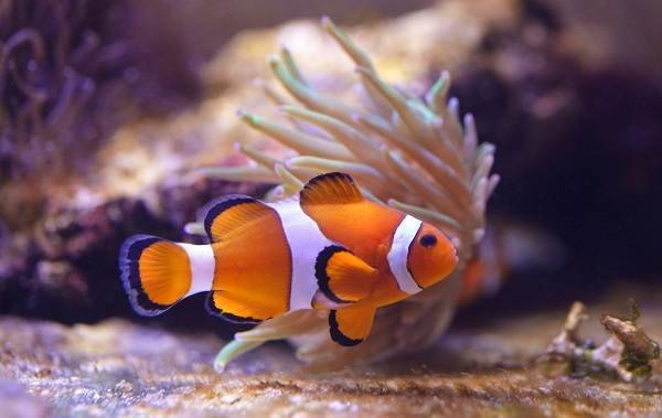 Анемоновый оцеллярис – рыба-клоун для детей, малыши очень любят её, ведь именно эта разновидность фигурировала в знаменитом мультфильме. Отличается роскошной внешностью – белые линии на оранжевом теле расположены так, что создают несколько равных по размеру ярких секций. На кончиках всех плавников, кроме спинного, имеется чёрная обводка. Отличительная особенность анемоновых клоунов – они создают симбиоз с разными видами актиний, а не с каким-то одним.