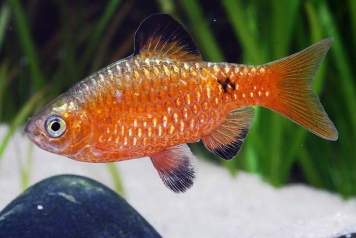 Особенность огненных барбусов – ярко золотистая окраса тела, и черная спина. Рыбок этих можно назвать золотыми, что опять же не плохо по фэншуй :). Рыбка эта активная, будет постоянно двигаться, в результате чего, станет украшением любого небольшого аквариума.