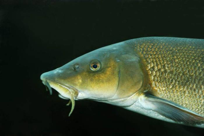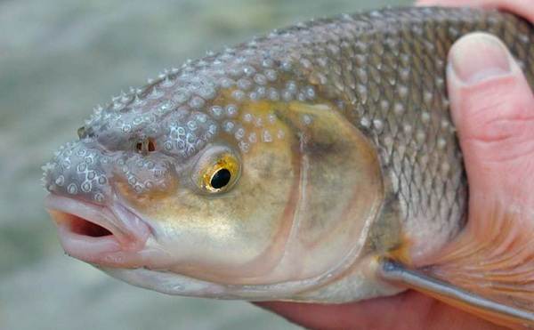 Голова небольшая, с закругленным рылом. Верхняя челюсть немного перекрывает нижнюю. Характерная особенность – острые крепкие глоточные зубы, способные легко разгрызать раковины моллюсков.