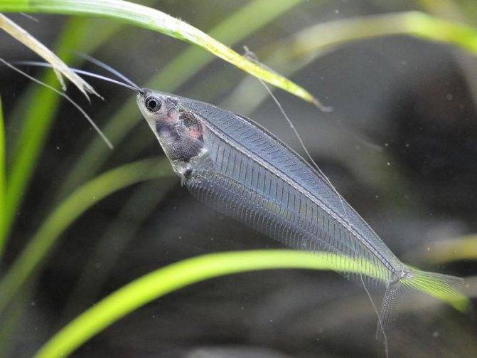Это еще одни прозрачные рыбы для аквариума. Несмотря на свое название, признать ее близким родственников сомов, обитающих в наших водоемах, невозможно. Туловище этих рыб сжато с боков, а не по вертикали. Это потому что стеклянные азиатские сомы не лежат на дне. Они активно перемещаются в воде и живут стайками. Прозрачные ткани тела позволяют увидеть нити ребер и тоненький позвоночник этих удивительных рыбешек. На первый взгляд кажется, что брюшная полость с внутренними органами у этих особей отсутствует вовсе. Однако это не так. Все они смещены к голове и похожи на продолжение жабр.