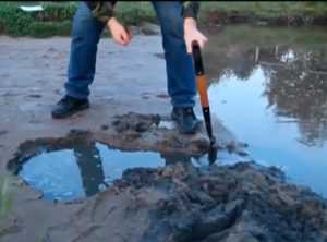 - Когда рыба окажется в яме, нужно быстро перегородить канавку лопатой или дощечкой, чтобы добыча не смогла выбраться в основной водоём. Теперь можно брать подсак или просто заходить в яму и ловить руками.