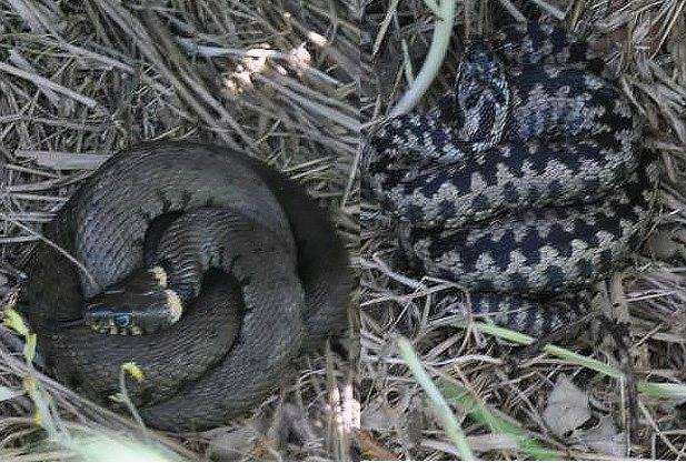 Слева — уж, справа — гадюка.