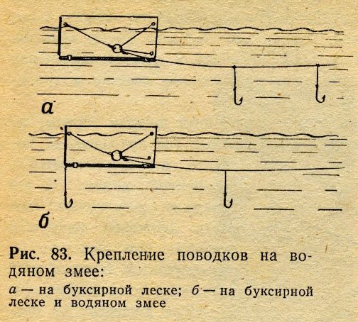 Поводок с крючком подвешивают к заднему колечку или непосредственно на буксирную леску. В этом случае их может быть 2-3. Некоторые рыболовы привязывают поводок и к заднему колечку, и к буксирной леске (рис. 83). Много крючков ставить не следует — это только осложнит ловлю, но отнюдь не увеличит количество трофеев.