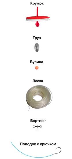 Жерлицы. На катушку наматывается леска, и на нее устанавливается грузило. Далее ставится поводок и двойной или тройной крючок. Катушка закрепляется на подставке в виде пластмассового диска и на этот же диск крепится пружина с флажком, который будет сигнализировать о поклевке.