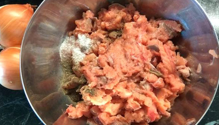 - Рыбу соединить с капустой и луком. Рыбка должна быть размятой. Эта смесь будет начинкой.