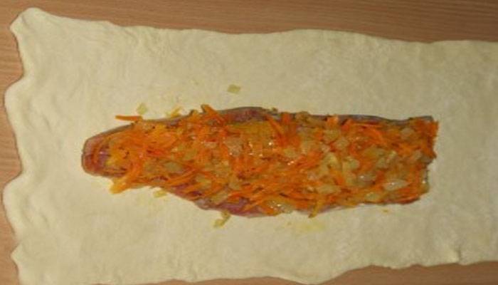 2. Пласт слоено-дрожжевого теста раскатываем в прямоугольник. По центру выкладываем промытое, обсушенное и сдобренное солью с перцем рыбное филе. Его можно не разрезать на куски, а положить прямо целиком. Поверх него, не выходя за габариты рыбы, выложить ровным слоем овощную поджарку.