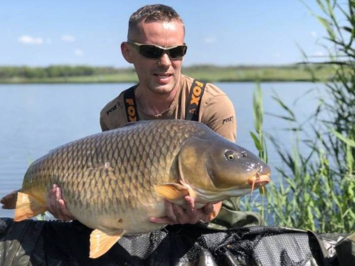 Подсачок всегда должен находиться под рукой. Когда будете вытягивать, пусть даже и намёка на сход рыбы нет, всё равно приготовьтесь! Вот, кстати, карп со сплошным чешуйчатым покровом.