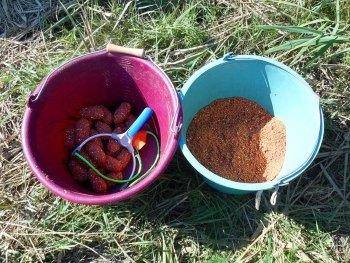 - Для прикармливания карпа приготовленную прикормку в ведре или другой емкости смешивают с грунтом – заранее приготовленной глиной, песком или просто взятой на берегу землей. После того как грунт распределился равномерно между частичками прикормки начинают добавлять воду и так же тщательно вымешивать образующеюся массу до густого состояния. Из массы настоявшейся в течение 5-10 минут, лепят 10-12 различных по плотности шаров диаметром 5-7 см.