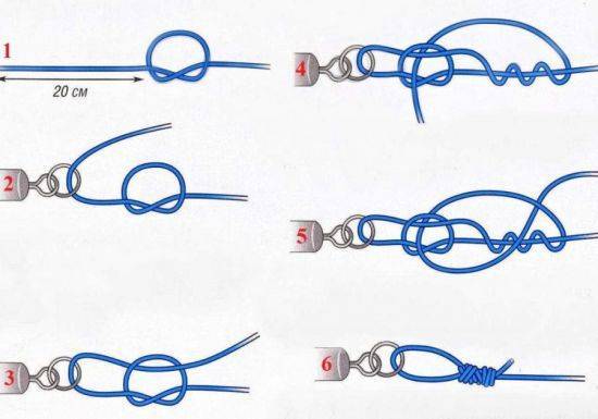 - Петлю лидкора продеть в ушко вертлюга и снова протянуть вертлюг в эту петлю.