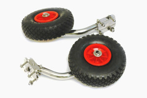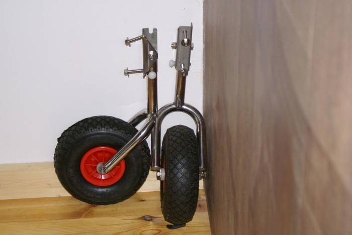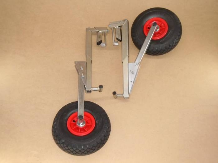 Подобные конструкции ориентированы на транспортировку лодки одним человеком на не большие расстояния. Они устанавливаются с помощью 4-х болтов к транцу, сделанному из фанеры. Имеется возможность регулировки высоты их установки благодаря длине крепежной шпильки.
