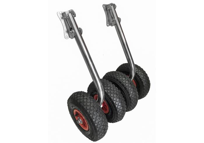Подобная модель имеет свою специфику установки. Шасси крепится к транцу таким образом, что их можно не снимать при транспортировке лодки в сложенном состоянии. Подобная конструкция имеет дополнительные достоинства, связанные с удобством в перемещении. При перемещении на воде, они не влияют на ее маневренность.