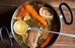 - Когда наш бульон закипит второй раз, высыпаем в него крупные кусочки сельдерея, 2 половинки моркови и луковицу. Убавляем огонь плиты до медленного и оставляем бульон томиться на 40 мин.