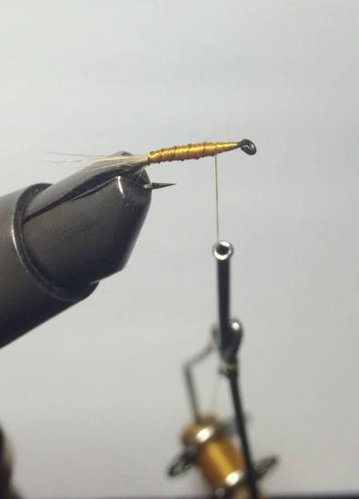 Если у вас нет тисков для вязания мушек , то подойдет медицинский зажим на первое время . Немного нужно промазать цевье клеем , вроде секундного , и намотать подложку из нити , аккуратно двигаясь по цевью от колечка к загибу крючка. Стараемся аккуратно почти виток к витку уложить нашу нить .У загиба останавливаемся и закрепим наши материалы как на фото: