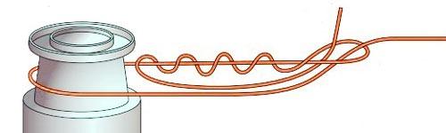 Шнур на шпулю механизма наматывают после закрепления катушки на спиннинге. Эту операцию можно сделать самостоятельно, а можно с помощью товарища, что намного упрощает процесс, не требуя дополнительных действий и использования приспособлений. Изначально спиннинг собирают на всю длину удилища и начиная с тюльпана, самого первого кольца на квивертипе снасти, пропускают шнур до самой шпули. К шпуле шнур крепят, применяя методику вязки самозатягивающегося узла. Связав узел, и затянув его на основании шпули, кончик свободной лески отрезают до остатка не более 2 мм, так как более длинный хвостик может мешать сбросу нити в процессе забросов, притормаживая её сход. Далее осуществляют намотку нити. При этом шнур должен быть в постоянном натяжении.