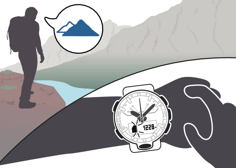 Часы снимают показания и отображают текущее значение высоты на основании значения атмосферного давления, измеряемого встроенным датчиком давления.