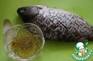 Рыбу выпотрошить, помыть. Сделать по всей площади тушки вертикальные надрезы, начиная от хребта и заканчивая возле брюшка, с интервалом в 2,5-3 см. Натереть специями, в том числе изнутри и полить лимонным соком.