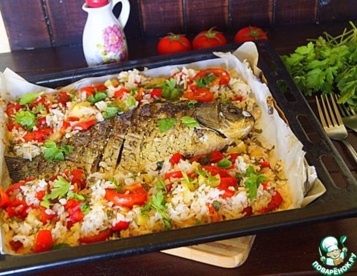 Аппетитная рыба с рисом и овощами – полноценное угощение, которое запекается легко и без затрат. В процессе приготовления мякоть пропитывается соками овощей, а рис остается рассыпчатым и в меру пряным. Необходимые продукты: