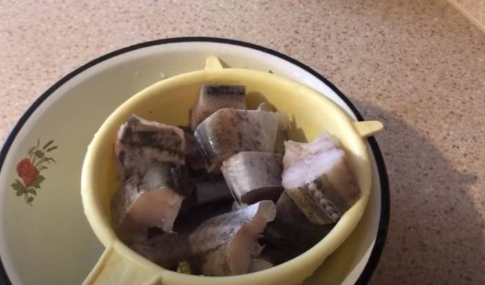 Затем рыбу нужно разрезать вдоль брюшка и вынуть внутренности, хорошо промыть внутри. Голову и хвост оставим для ухи, а остальное мясо порежем на кусочки.