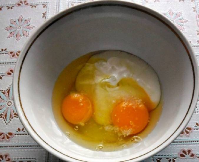 - В глубокую миску вбейте яйца, добавьте специи, аккуратно взболтайте венчиком до получения пены.