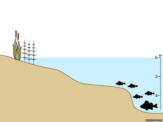 Сам залив не очень глубокий, до 3-4 м глубиной, но я знаю там одну яму (метров 12-13). От берега в центр ямы встречаются бровки, на которых и держится крупный окунь.